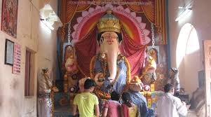 The main highlight is the massive idol of Lord Ganesha, crafted with stunning detailing and vibrant colors.