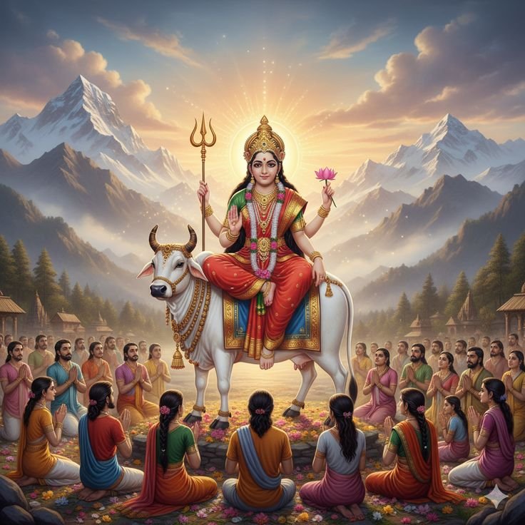 In her form as Shailaputri, Maa Durga is depicted riding a bull (Nandi), symbolizing steadfastness, patience, and self-control. She holds