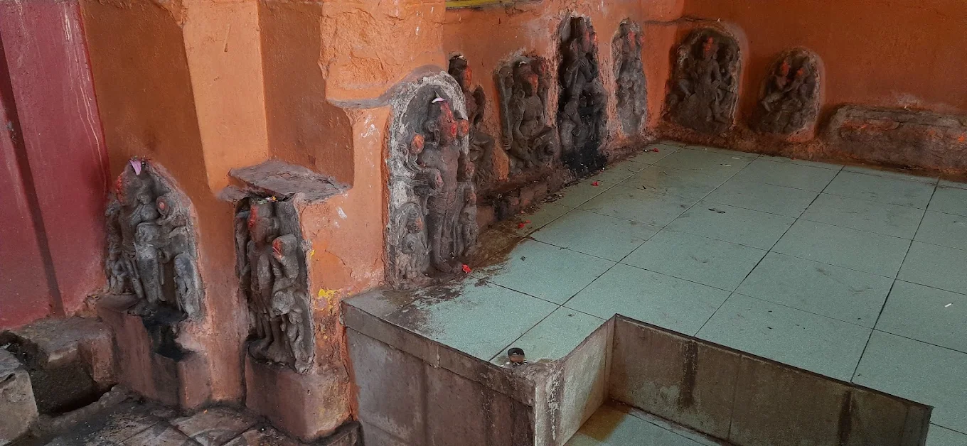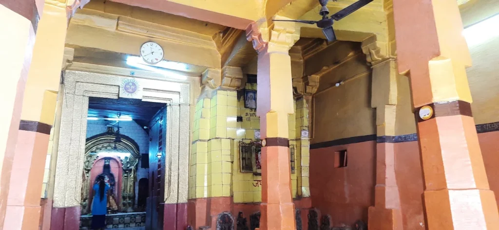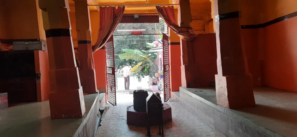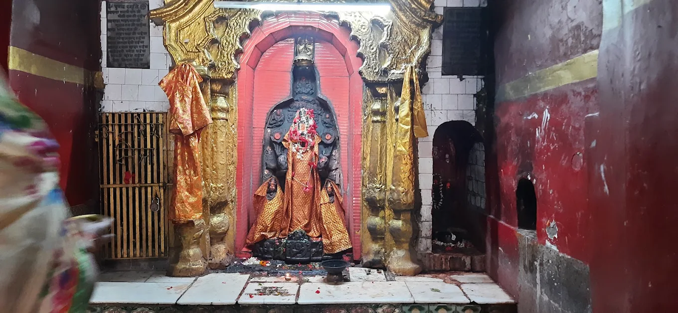 The temple structure includes a courtyard with three shikharas (temple spires), two are modern and one ancient.