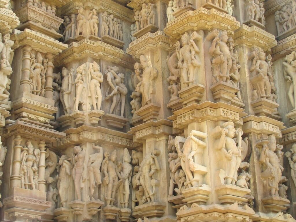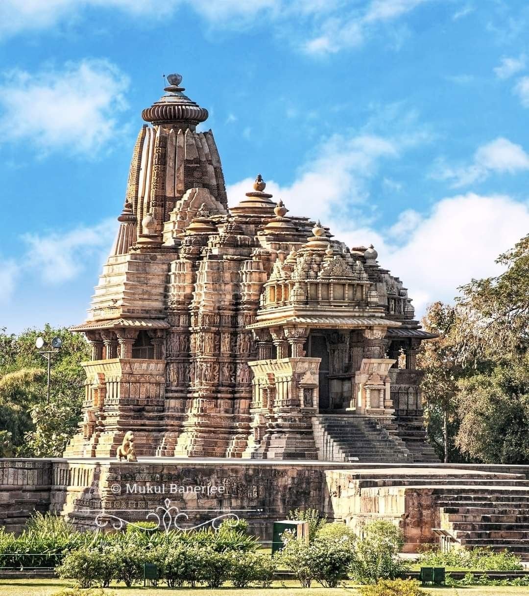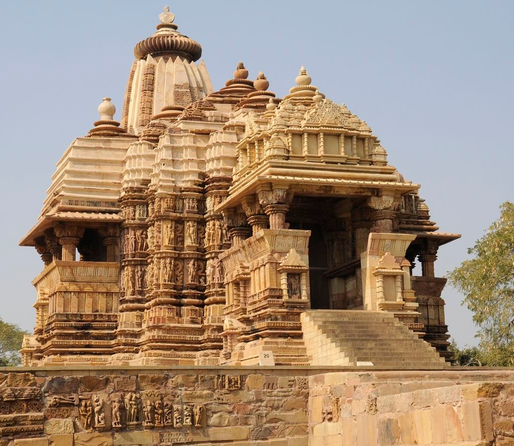 The outer walls are adorned with beautiful sculptures of gods, goddesses, celestial nymphs, and mythological motifs, typical of Khajuraho’s world-famous art.