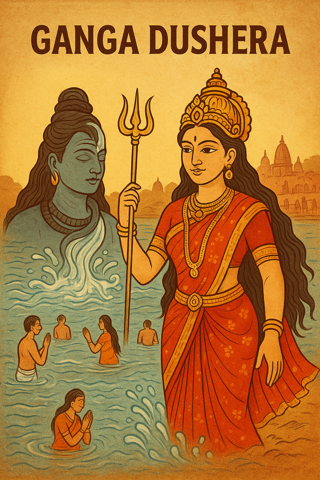Ganga Dushera is a significant Hindu festival that celebrates the divine descent of the sacred river Ganga from heaven to earth. It falls on the Dashami, or the tenth day of the waxing moon in the month of Jyeshtha (May–June). According to Hindu mythology, King Bhagiratha performed severe penance to bring the holy river to earth so that the souls of his ancestors could attain salvation. Pleased with his devotion, the river Ganga descended, and Lord Shiva bore her mighty flow in his matted locks to lessen its force before it reached earth.