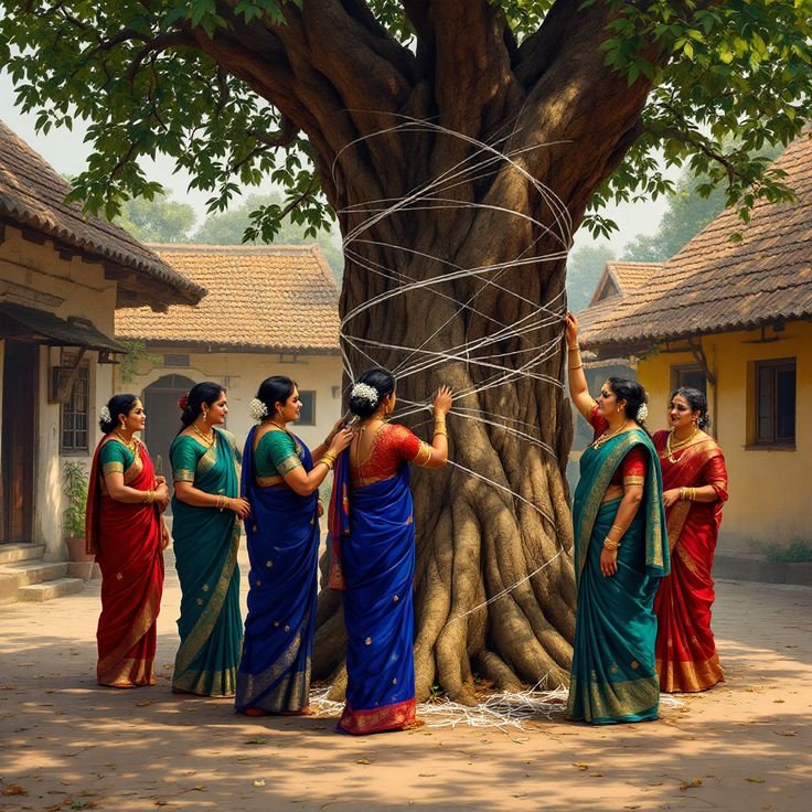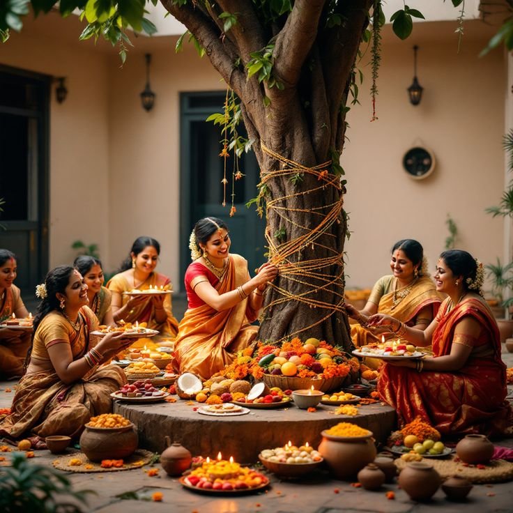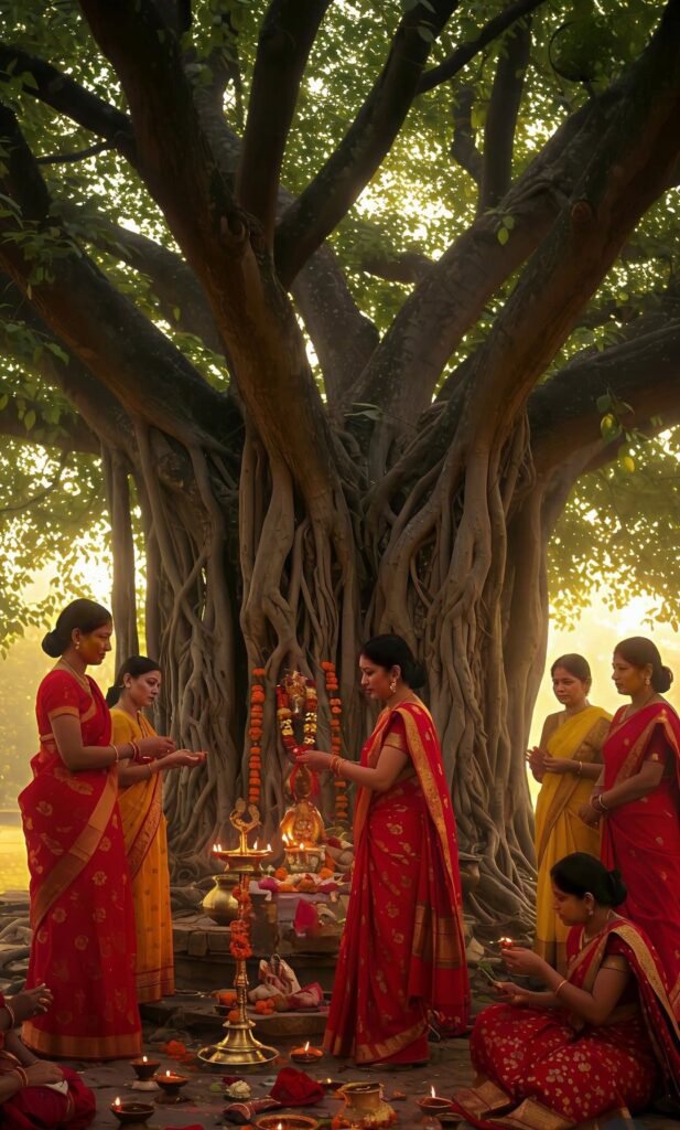 The main ritual centers around worshipping the Vat (banyan) tree, which represents longevity and strength. Women wake up early, bathe, dress in traditional attire—often red or yellow sarees—and adorn themselves with bridal symbols like bangles, bindis, and sindoor. They observe a fast and gather around banyan trees, offering water, fruits, flowers, and sacred threads. By tying the threads around the tree and performing circumambulations, they pray for their husband’s health and happiness.
