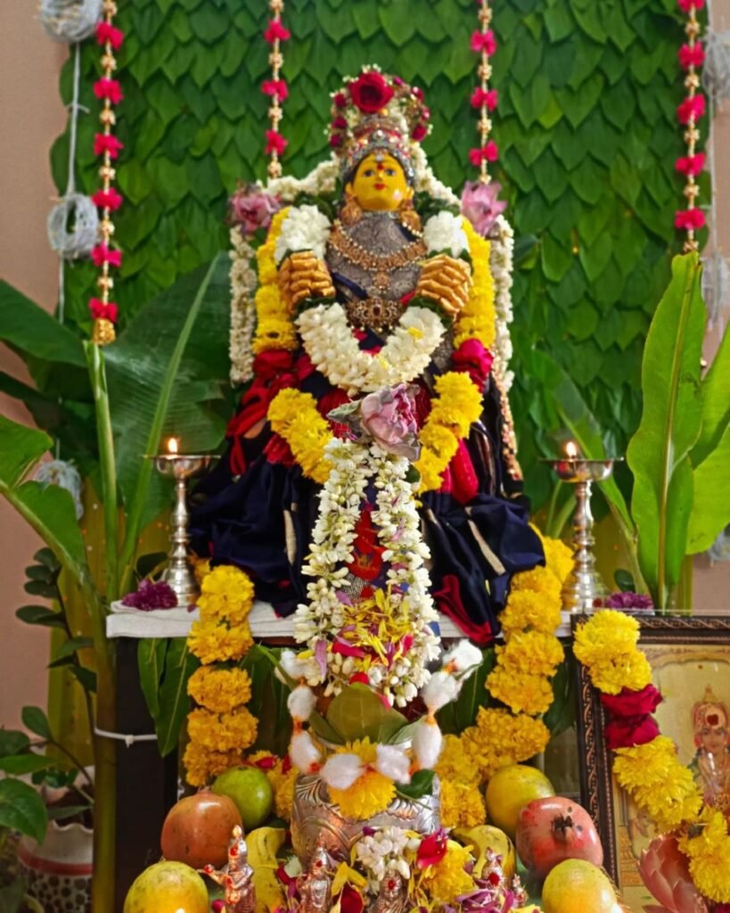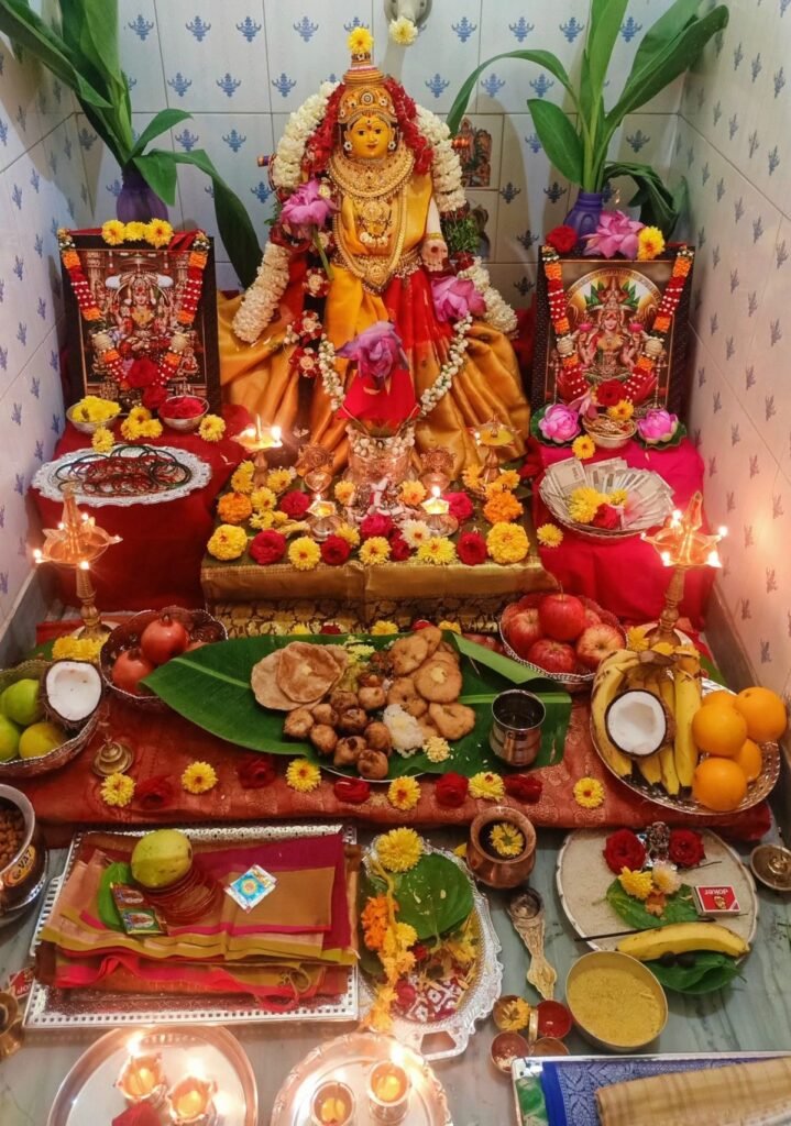 Special puja is performed by offering fruits, sweets, betel leaves, turmeric, and vermilion to the goddess. Women chant Lakshmi mantras and sing devotional songs, invoking the eight forms of Lakshmi (Ashtalakshmi). Fasting is observed during the day, and prayers are offered for the prosperity, health, and well-being of the family.