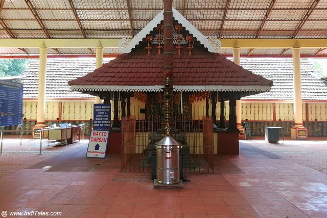 The temple complex exhibits traditional Kerala architectural style, featuring tiled sloping roofs and simple, elegant structural designs