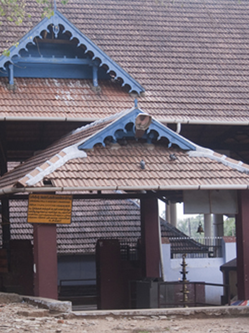 The temple is built in traditional Kerala style, characterized by gabled roofs and woodwork.