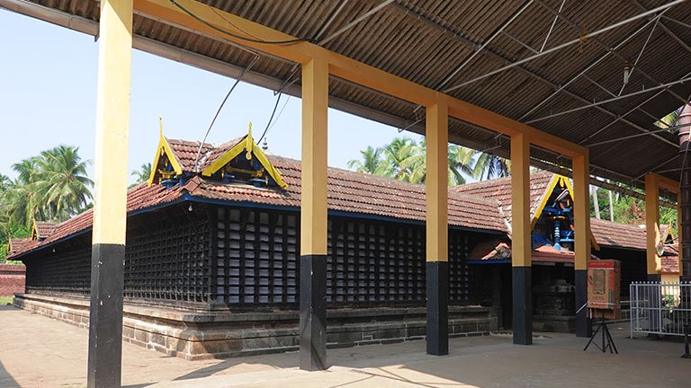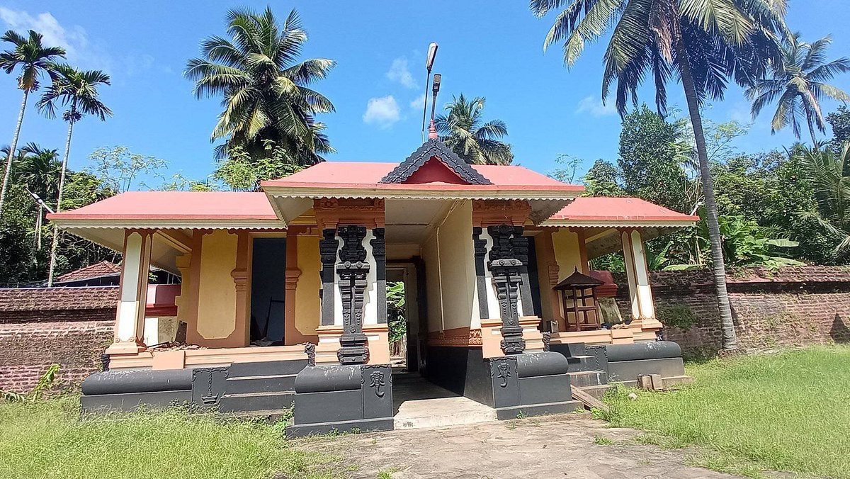 Intricate wood and stucco carvings—featuring scenes from the Ramayana and Mahabharata—adorn the temple roof and walls. The superstructure combines granite base with laterite, terracotta tiles, and timber to endure monsoon rains.