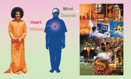 There are two important organs for man. One is the heart and the other is the hand. The head is preoccupied with enquiring into mundane phenomena. It is concerned with the external; its focus is on objects outside. The heart looks at what is within. The concern with the external has been termed pravritthi maarga (the path of externals)… All man’s actions today, including the knowledge he acquires and the wealth he gets, are related to the pravritthi maarga. The six vices of kaama (lust), krodha (anger), moha (infatuation), lobha (greed), madha (pride) and maathsarya (jealousy) are related to the pravritthi maarga. These undergo constant changes. Because the body is associated with these qualities, it is also subject to change.