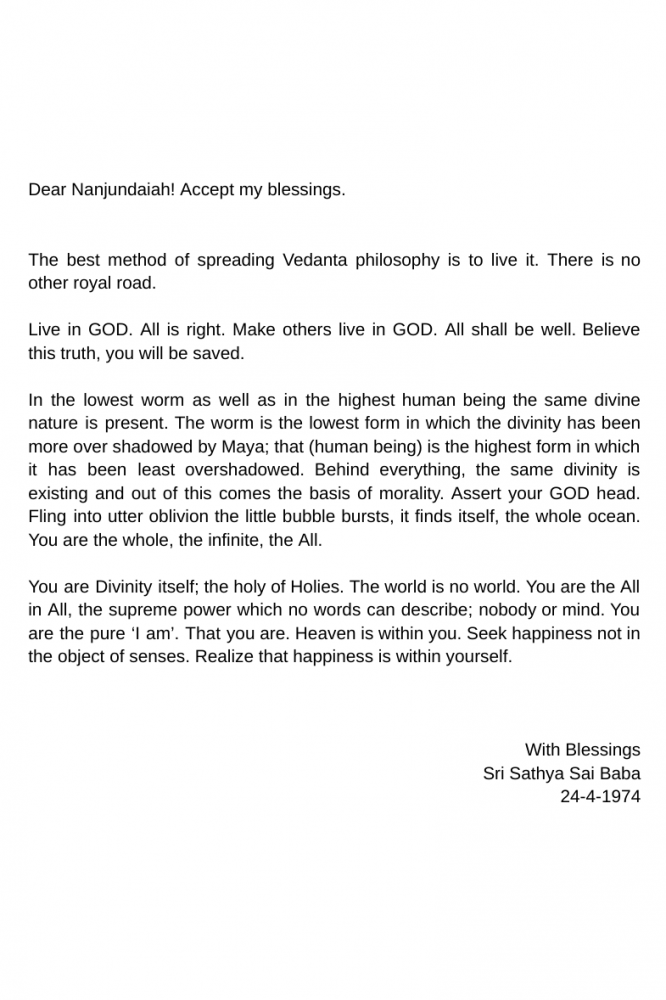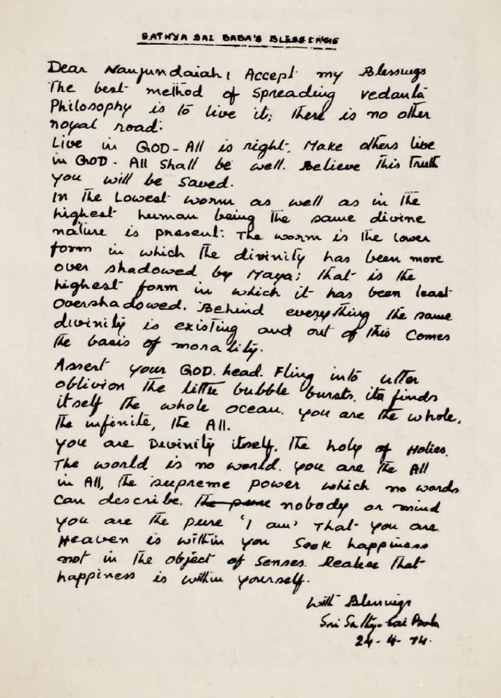 First coming to Sri Sathya Sai Baba in 1967, Professor M. Nanjundaiah served a lengthy career in higher education, joining the Sri Sathya Sai Institute of Higher Learning in 1973 at the College in Brindavan. Professor Nanjundaiah wrote a biography of Sri Sathya Sai Baba in Telugu. The letter addressing him is presented below with translation on a white background.