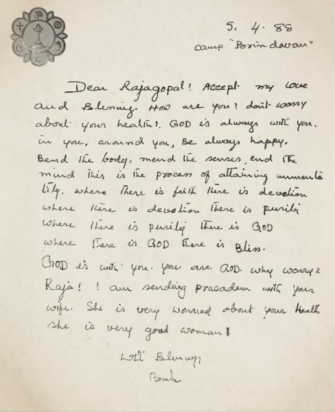 These five letters are addressed to a devotee named Rajagopal or Raja. In some of the letters Swami mentions Raja’s wife who is Annalisa (Jyoti) Rajagopal, an Italian.