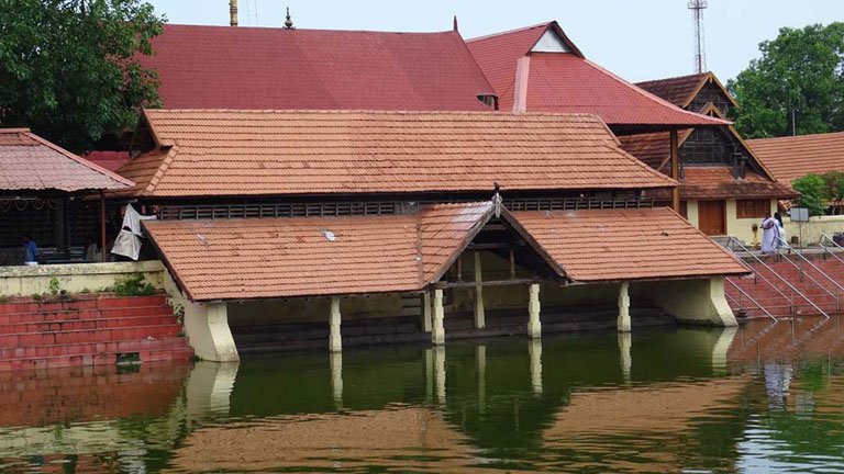 The existing temple reflects traditional Kerala architecture—sloping tiled roofs and wood craftsmanship (inferred from regional style and images). The idol’s presentation suggests historic antiquity blended with modern reconstruction.